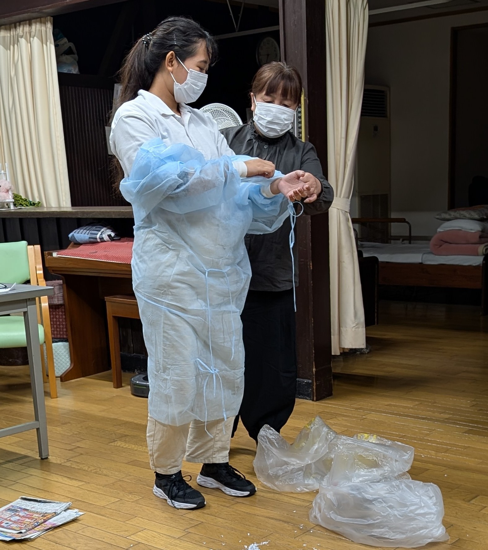 消毒液の作り方や防護服の着脱なども確認することができ、これから感染症の増える時季を迎えるにあたり、非常に有意義な研修となりました。