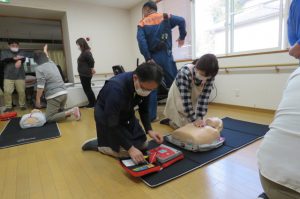 今月の社内研修は、東広島市安芸津分署の方にご指導いただきながら「AEDを用いた心肺蘇生法の基本」について学びました。